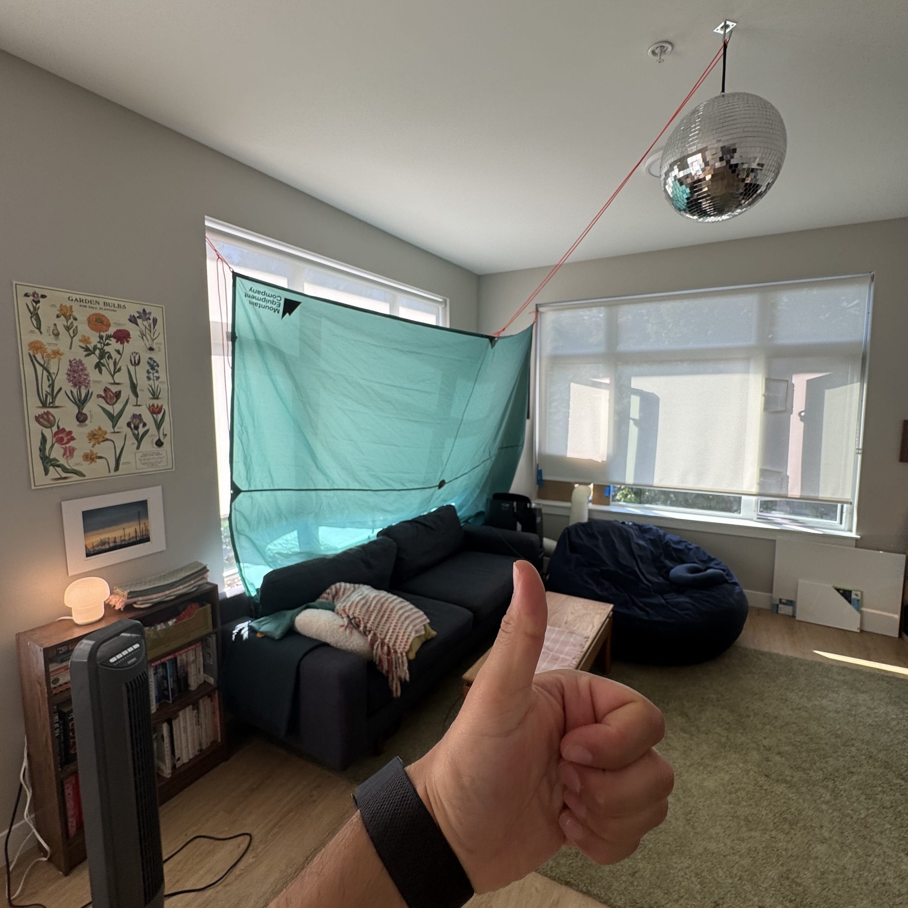 Put up a tarp in our living room to combat the afternoon heat.